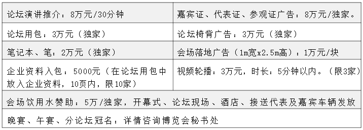 博览会为贵单位提供高层洽谈、项目对接等服务。赞助级别:38万(特约单位)、58万(协办单位)、88万(特别协办单位)、128万(战略合作单位)、188万(独家冠名单位)或进行专属定制服务。